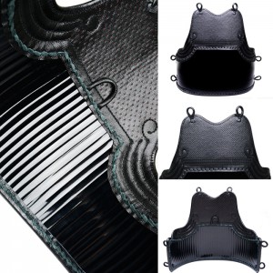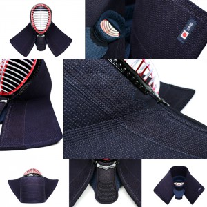 面は、高井武道具株式会社製のIBBジュラルミン面金を始めとする厳選した国産の素材を使用しております。また面布団には数種類の布団を積層することにより、軽さと耐久性を兼ね備えた仕上りです。面内輪には、吸汗・発汗性が高く肌触りの良いテトニット生地を採用。ヘリ・アゴには紺鹿革を使用した高級感ある仕上がりです。