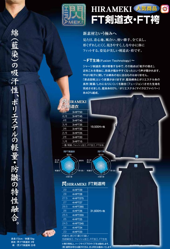 綿(藍染)の吸汗性、ポリエステルの軽量・防皺の特性を融合したFT生地を使用。FT生地 (Fusion Technology)ジャージ剣道衣・袴が普及してきておりますが、その弱点は「吸汗の弱さ」です。これは防具の痛みやすさに繋がります。もともと吸汗に優れていた藍染綿糸とポリエステルを融合させた生地が完成しました。■仕様一重、背継、ウォッシュ加工、FT生地