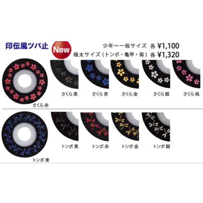 ★剣道竹刀用ツバ止めゴム★○ツバ止めで オシャレで人気の 『印伝風鍔止め』○一般的なツバ止めと違い使用中にずれてくる事がありません!○見た目が 『オシャレで格好良く』少年用の竹刀~大人用の竹刀まで(3.0~3.9まで)対応できる 『優れもの』※3.9柄太竹刀にはご使用頂けません。○外側/人工皮革・内側/ゴム○トンボ4色・小桜5色・波3色ございます。好みの柄&色をお選び下さい!○両面同じ柄&色となっております。○大きさ:直径約7cm/厚み約4mm